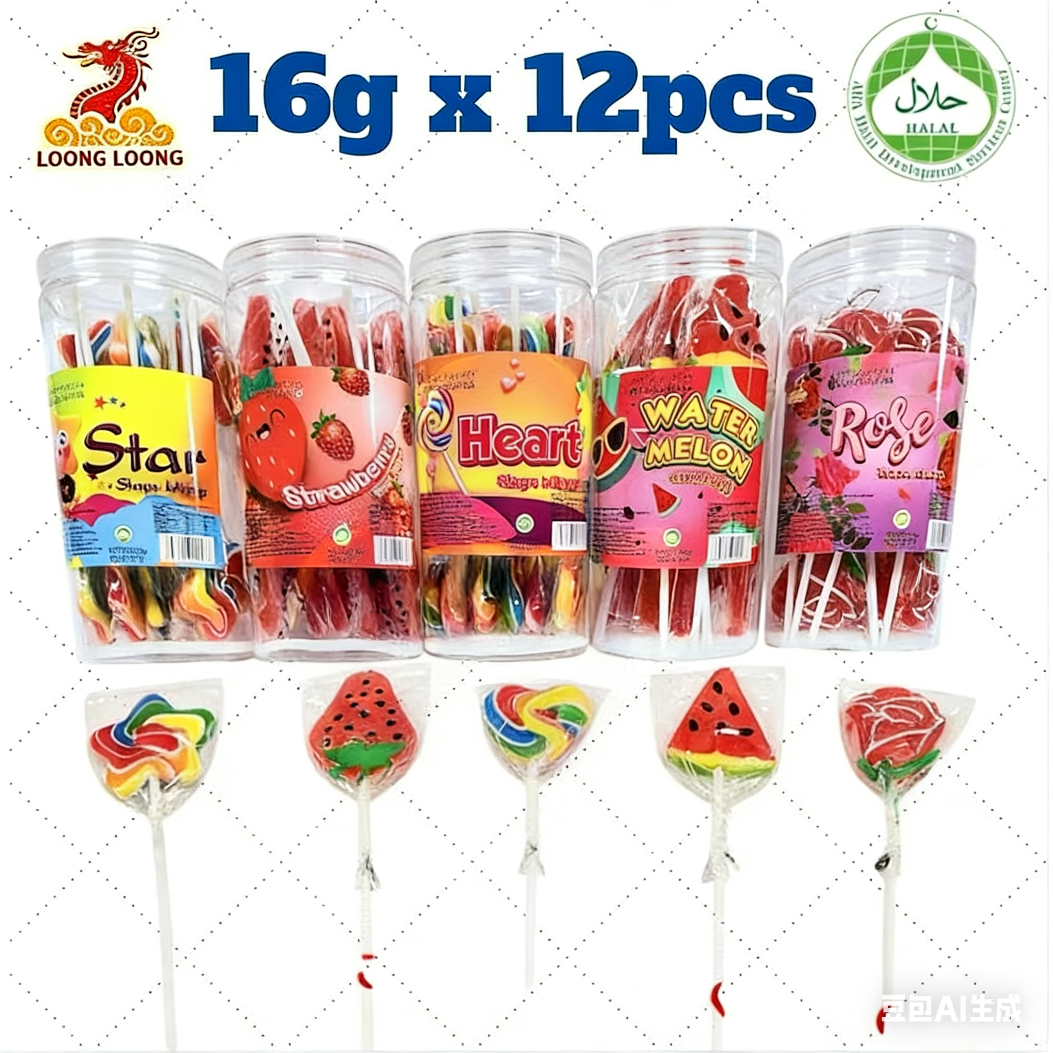 12pcs x16g Loong Loong Lollipop dalam bekas (star / strawberry / heart / watermelon / rose))