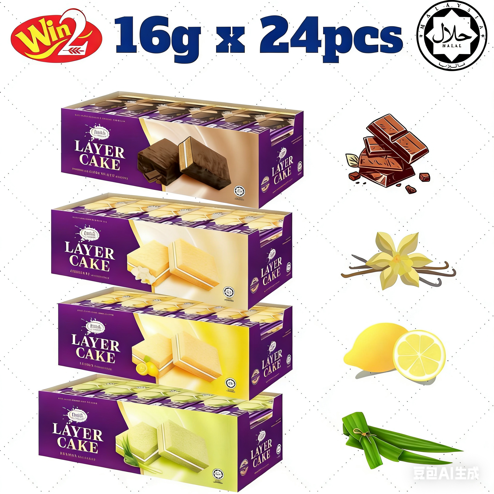 24pcs x 16g WIN2 Flavour Layer Cake kek(CHOCOLATE / PANDAN / LEMON / ORIGINAL) BAKE STORY HALAL